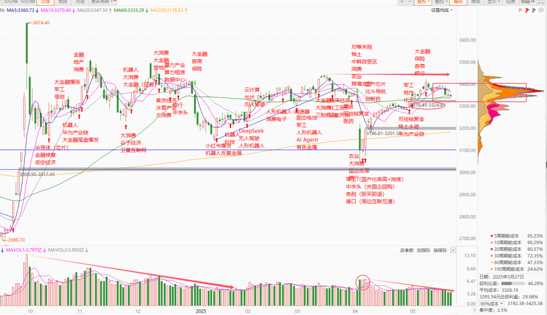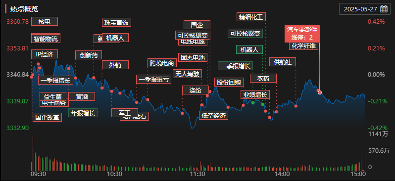 2025年5月27日,市场全天震荡调整,创业板指领跌。上证指数跌幅0.18%,报收3340.69点,深证成指跌幅0.61%,报收10029.11点,创业板指跌幅0.68%,报收1991.64点。