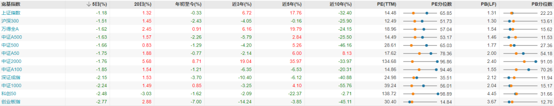 周二各大指数缩量小幅调整,百分位、估值有所下移,可以作为参考因子,当分位点达到高点,可以辅助短期操作进行高抛,当分位点调整至低点,可以辅助短期操作进行低吸。中期可以在低估点位,逐步开始定投。((蓝色当前,黄色是平均)。数据来源:Wind